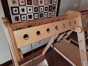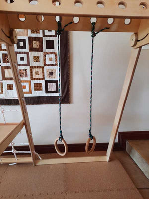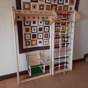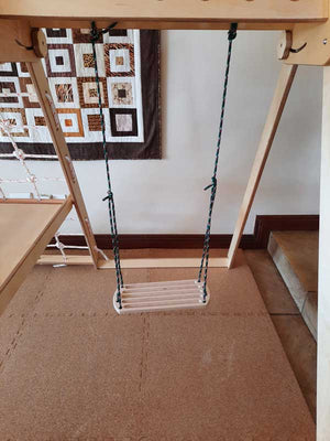 5 activities: Climbing ladder, Climbing net, Play platform, Trapeze rings and Child Swing